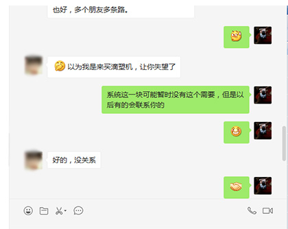 今早,有個客戶微信加到我,而且上面備注道:滴塑機,后來一家這個客戶的微信,這個客戶就直接發:清明節過后我去你們廠內看下設備,一看到消息:心里想到,這個客戶這么直接的嗎?后來我又問道這個客戶是做什么產品的?又給這個客戶發了金裕廠內地址,和一些產品的視頻...結果這個客戶發消息說到,剛剛在接聽電話,不好意思,我們也是做滴塑機系統的,到目前為止已經做了5年了,之前都是做福建這邊的,福建這邊在用我們的比較多,我們的功能跟樂創90%是一樣的,只有一點點不一樣,然后我們的系統會比樂創便宜非常多,就看你們有沒有興趣了解一下,就算生意沒做成,大家碰個面認識一下也好,多個朋友多條路.....以為我是來買滴塑機,讓你失望了。看到這里,原來不是客戶啊,隨后有跟這個客戶聊了一會,問到這個客戶是從哪里聯系到我這的,客戶說到:你們廣告做得很到位,在百度上找的的....果然金裕從哪方面來講都是很棒的!![]() |