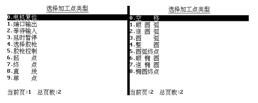 點膠機選擇加工指令類型在文件編輯界面,通過上下鍵將焦點移動到“類型”一欄,按下確定鍵,彈出選擇加工點類型界面: ![]() 1.電機復位:可指定某個或多個電機復位,指定的電機完成復位后繼續 執行下一條指令。 2.端口輸出:可指定某個端口輸出開或關信號,延時設定的時間后繼續 執行下一條指令。 3.等待輸入:等待某個輸入端口為開或關才繼續下一步動作,可設定一 個等待超時時間,超時時間設置為0則一直等待該信號到達才繼續下一 步加工,超時時間不為0則超時時間到達后跳轉到指定的標簽處開始執行 加工。 4.延時暫停:延時設定的時間之后繼續下一步動作,若延時時間設置為 0則暫停程序執行,直到再次按下啟動或暫停鍵。 5.選擇膠槍:選擇哪把膠槍進行工作,默認為選擇第一把膠槍。 6.膠槍控制:可單獨控制某個膠槍打開和關閉。該指令一般在導圖功能 中使用,正常情況下使用“起點”和“終點”或者“單點”指令來控 制膠槍開關即可。 7.定義標簽:標簽名稱可以為數字、字母、符號或中文,程序調用或跳 轉時輸入相應的標簽名稱則可調用或跳轉到該位置。 8.設定速度:單位為毫米/秒,只能設置軌跡的速度不能設置空移的速 度,若設置為0則表示恢復到文件初始設置的軌跡速度。 9.加工結束:程序執行到這條指令時停止加工。 10.程序調用:可設置“文件號”,“起始標簽”、“結束標簽” “調 用次數”這幾個參數。 |