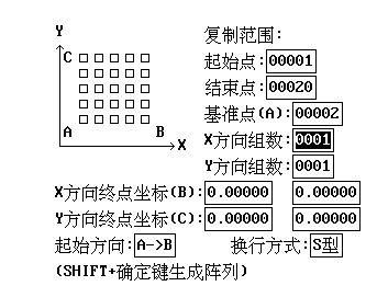 復制范圍:需要復制的圖形的起始加工點號和結束加工點號。 基準點A:需要復制的圖形上的某個參考點,教導XY方向間距時需要以 該點為基準,默認為選擇圖形的第一個點。 X方向組數:陣列的X方向組數。 Y方向組數:陣列的Y方向組數,只復制一次則將XY方向組數均設成1。 X方向終點B坐標:該坐標必須是X方向最后一組對應基準點A的坐標。 可直接按教導按鈕將當前坐標教導進去。 Y方向終點C坐標:該坐標必須是Y方向最后一組對應基準點A的坐標。 可直接按教導按鈕將當前坐標教導進去。 起始方向:是先由A到B還是先由A到C。 換行方式:有S形和Z形兩種,Z形換方式當加工完一行后會返回到起始 點開始加工下一行,S形換行則不會返回起始點而是以直接折回的方式 加工下一行。 按下定位鍵可定位到基準點。 東莞市金裕自動化機械設備有限公司成立于2000年,金裕坐落于東莞市大嶺山向東工業區,創辦硅膠、PVC商標禮品生產設備.金裕研發的全自動全自動點膠機、矽膠機、油壓機、KPU鞋材機以及終于實現了的智能無人車間生產流水線,金裕的自動化設備可以做到讓你省人、省電、省管理。金裕公司歡迎新老顧客來訪,選擇金裕,沒有顧慮。www.touristlink.com.cn |