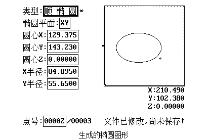 點膠機編程之- 生成橢圓 在生成橢圓的界面中按Shift+XY方向鍵教導(dǎo)橢圓的各個頂點(XY每個方向至少需要教導(dǎo)一個頂點才能生成橢圓),按第一次為教導(dǎo)坐標(biāo),按第二次為取消所教導(dǎo)的坐標(biāo)。按下定位鍵可運動到教導(dǎo)好的坐標(biāo)的中間。教導(dǎo)好起點、終點之后,按數(shù)字鍵1選擇橢圓方向,按Shift+確定鍵生成橢圓。該界面的各個頂點的數(shù)據(jù)是一直保存的,即使退出該界面也仍然存在,所以在教導(dǎo)橢圓時可中途退出該界面,再次進(jìn)入時教導(dǎo)的數(shù)據(jù)依然存在。