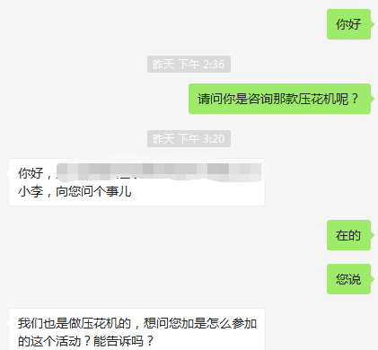 ![]() 昨天下午一個客戶微信咨詢,備注上還寫著壓花機,我就以為是客戶咨詢壓花機,就同意了,一開始禮貌問了下這個客戶需要哪方面設備,沒想到這個客戶回復我說道:他也是做壓花機,這次來加我微信就是想問一件事情,發了個鏈接給我,出于好奇心還是打開了,沒想到打開鏈接里面壓花機的品牌投票,我就很納悶了,也沒有參加過這個活動......于是這個客戶就問到:我們也是做壓花機的,想問您加是怎么參加的這個活動?能告訴嗎?不好意思,要不是你發的這個鏈接給我,我都不知道有這個評選,雖然是想幫助這個同行的,但是真的是不知道,后來這個同行也沒有說什么商業互夸了幾句聊了起來,原來這個同行也是通過客戶給發的鏈接才得知的這個消息...........至于投票的事情大家也不用操心了,這個事情是真是假還有待了解! 東莞市金裕自動化機械設備有限公司成立于2000年,金裕坐落于東莞市大嶺山向東工業區,創辦硅膠、PVC商標禮品生產設備.金裕研發的全自動全自動點膠機、矽膠機、油壓機、KPU鞋材機以及終于實現了的智能無人車間生產流水線,金裕的自動化設備可以做到讓你省人、省電、省管理。金裕公司歡迎新老來訪,選擇金裕,沒有顧慮。www.touristlink.com.cn |