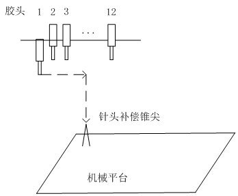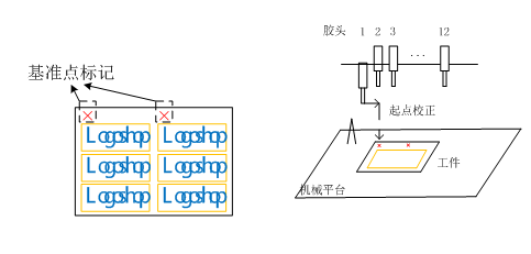 滴塑機針頭補償 當各種異常原因導致針頭歪了,或者更換了針頭時。為了補償針頭更換后發生的位置偏差,需要進行針頭補償操作。 如圖所示。針頭補償的過程就是通過示教盒或Logoshop的針頭補償功能,依次把各個針頭通過點動移動至對準滴塑機平臺上的固定錐尖。XYZ方向都務必對準,否則可能會對后面的調試帶來較大的麻煩。 基準點和起點校正 如圖所示,在軟件設計滴塑機路徑的時候,需要在關鍵位置設置一個基準點。調試時,使用起點校正功能,把針頭對準模具上的與基準點對應的實際基準位置。才能進一步的調試和加工。設置基準點和進行起點校正,就是把程序坐標系和實際的模具的機械坐標系聯系起來。
