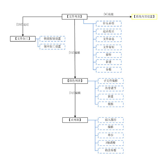 ![]() 上圖為示點膠機的手柄盒操作界面層次示意圖。用戶主要用到的就是4個相關界面:【文件列表】、【顏色列表】、【點列表】、【文件加工】。