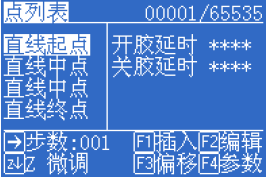 編輯點的參數。對于一段圖形。起點有開膠延時、速度參數,直線中點有速度參數(運動中變速),終點有關膠延時、拉絲高度、上抬高度參數。這些參數都只對這段圖形生效。