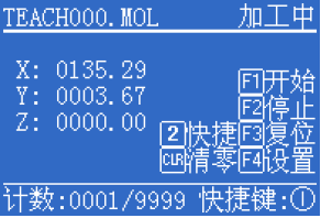 輸入數字1~8可以設置當前文件的快捷按鈕。 另外,以列表方式顯示出了已有效的快捷按鈕所對應的文件。按[CLR]清除,可以清除該快捷鍵對應的加工文件。設置好該文件的快捷鍵后,按[ENT]保存。 多個文件要設置快捷按鈕時,需要分別選擇每個文件設置。設置好所有的快捷按鈕后,在加工控制界面中,按下機器上的快捷按鈕,便可以開始直接加工對應文件。