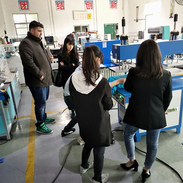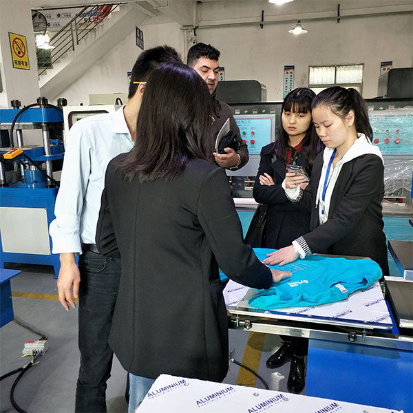 今天上午廠內來一位意大利的客戶,這次客戶主要是過來看凹凸模壓花設備的,來的時候帶來了一個翻譯來到了現場。在打樣過程中我們的技術人員邊給這個客戶介紹凹凸模的流程翻譯在一旁邊翻譯,現場這個意大利客戶現場看到我們技術人員打樣的過程,還是挺滿意的,之后我們外貿銷售人員帶顧客來到了二樓的樣品間繼續介紹,過來一會吃了個飯后,聊了一會,就下了一臺凹凸模壓花機