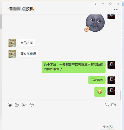 剛剛微信上有位譚先生加我微信,備注上打的是咨詢點膠機,然后我就添加同意了。問到這個客戶是咨詢8色點膠機呢?還是12色點膠機呢?這個客戶說8色的吧,顏色不是很多,后來這個客戶又說到12色的點膠機,咨詢一詢問,這個客戶是做pvc產品,不過是第一次接觸,然后客戶就問到,你們師傅會過來教嗎?我:有的,最好是到我們廠內學,是最方便的,當然我們的師傅也可以過去,但要提供師傅住食宿的問題。后面就給這個客戶發了幾個pvc產品的視頻,過來一會這個客戶又問道:學pvc產品大概需要多久的時間,我打趣著說,這個要看你領悟的程度了,一般是3-5天,然后客戶特別可愛的問答,要交學費嗎?哈哈我立馬回復到:不用不用的,免費的....后來客戶有回復我到:過幾天去的話給你消息..![]() 東莞市金裕自動化機械設備有限公司成立于2000年,金裕坐落于東莞市大嶺山向東工業區,創辦硅膠、PVC商標禮品生產設備.金裕研發的全自動全自動點膠機、矽膠機、油壓機、KPU鞋材機以及終于實現了的智能無人車間生產流水線,金裕的自動化設備可以做到讓你省人、省電、省管理。金裕公司歡迎新老顧客來訪,選擇金裕,沒有顧慮。www.touristlink.com.cn |